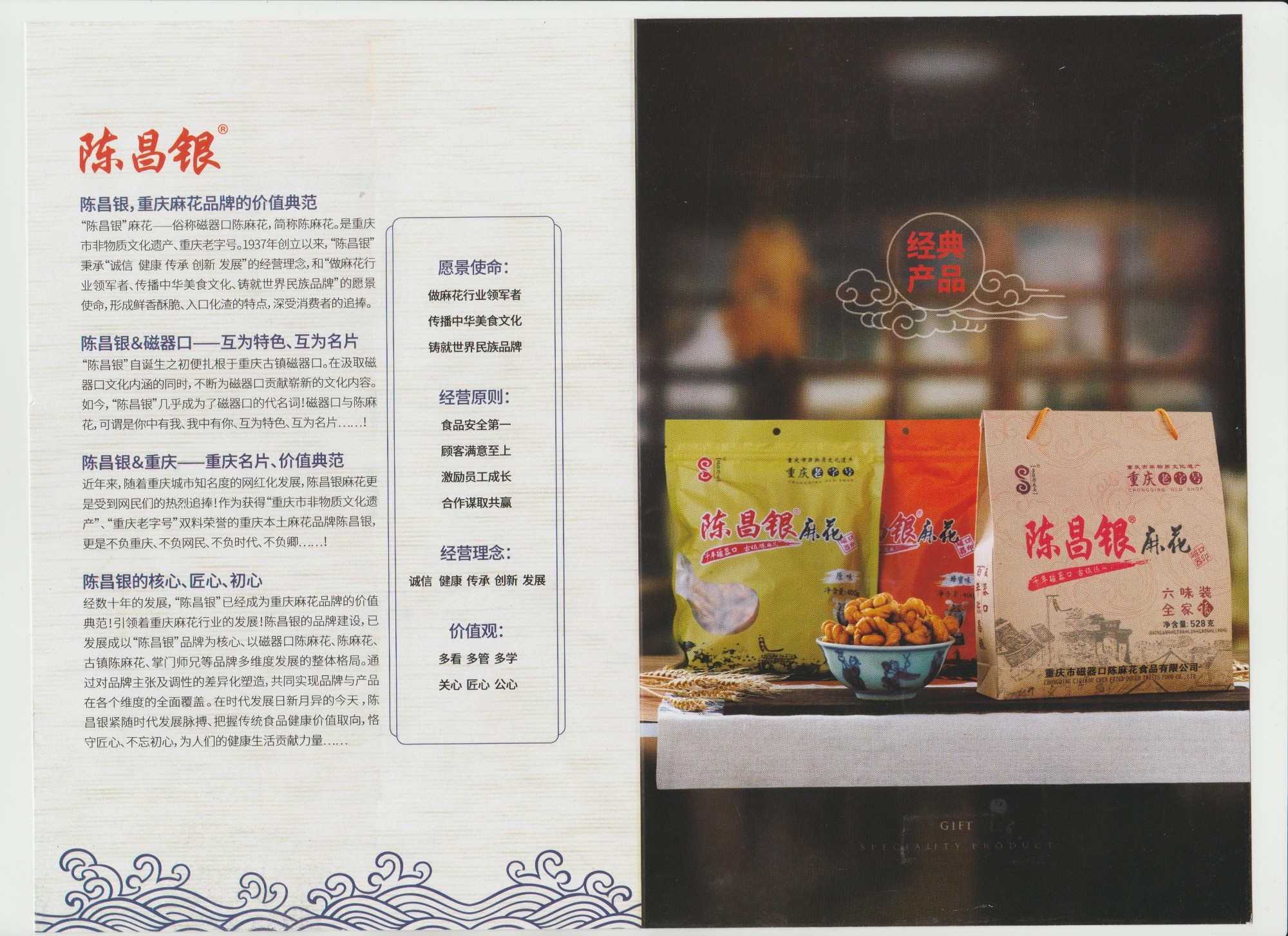 公司致力于研究傳統(tǒng)的麻花配方,不斷推陳出新先后開發(fā)了原味、麻辣、椒鹽、五香、黑芝麻、海苔、玉米、蜂蜜等十多種口味的麻花,讓集香、酥、脆為一身的重慶名小吃-----陳昌銀麻花形成了獨具特色的麻花系列,使傳統(tǒng)的食品,獲得新生。憑借數(shù)十年的誠信經(jīng)營,優(yōu)良品質(zhì),樹立了良好的信譽度,成為重慶的名特小吃中的一張名片。